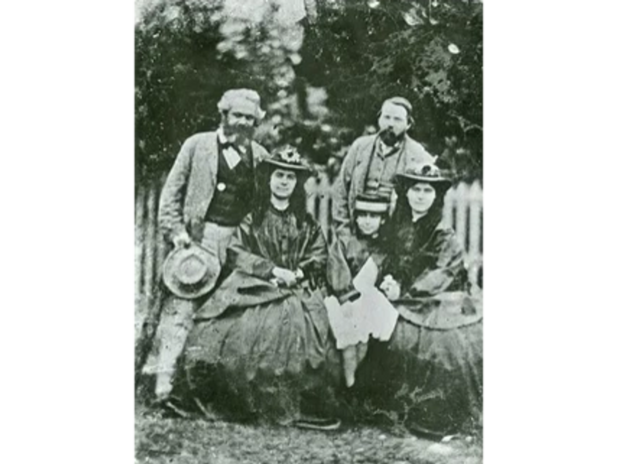 Karl Marx, Friedrich Engels and Marx's daughters from left: Jenny (1844–1883), Eleanor (1855–1898) and Laura (1845–1911). This photo was taken in 1860 and is accessible at https://commons.wikimedia.org/wiki/File:Marx%2BFamily_and_Engels.jpg#/media/File:Marx+Family_and_Engels.jpg